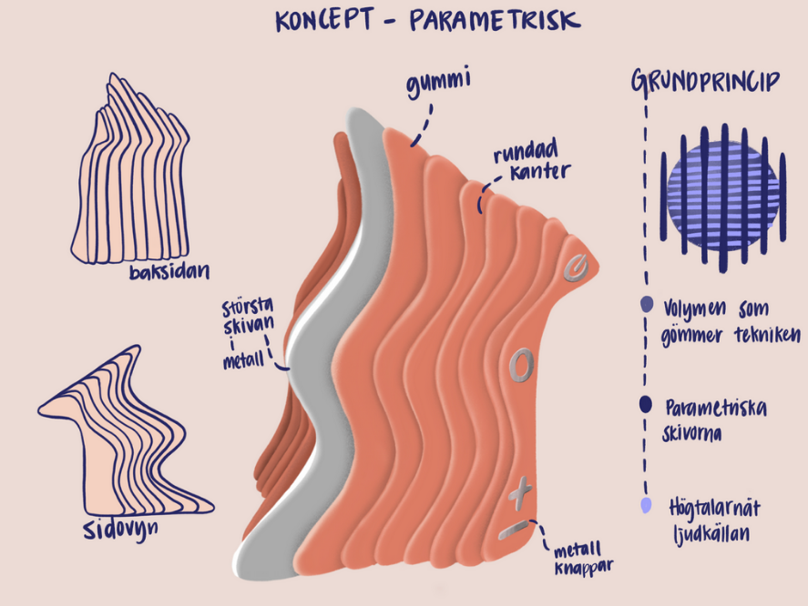 After that, a semantic analysis was conducted to highlight the connections between the expressions on the word scale and the images chosen for the expression board. Sketches inspired by these impressions were produced, leading to three concepts, of which one was selected as the final concept. The final concept was built in Alias and then transferred to Vred to generate realistic renderings that emphasized the speaker’s size and form.