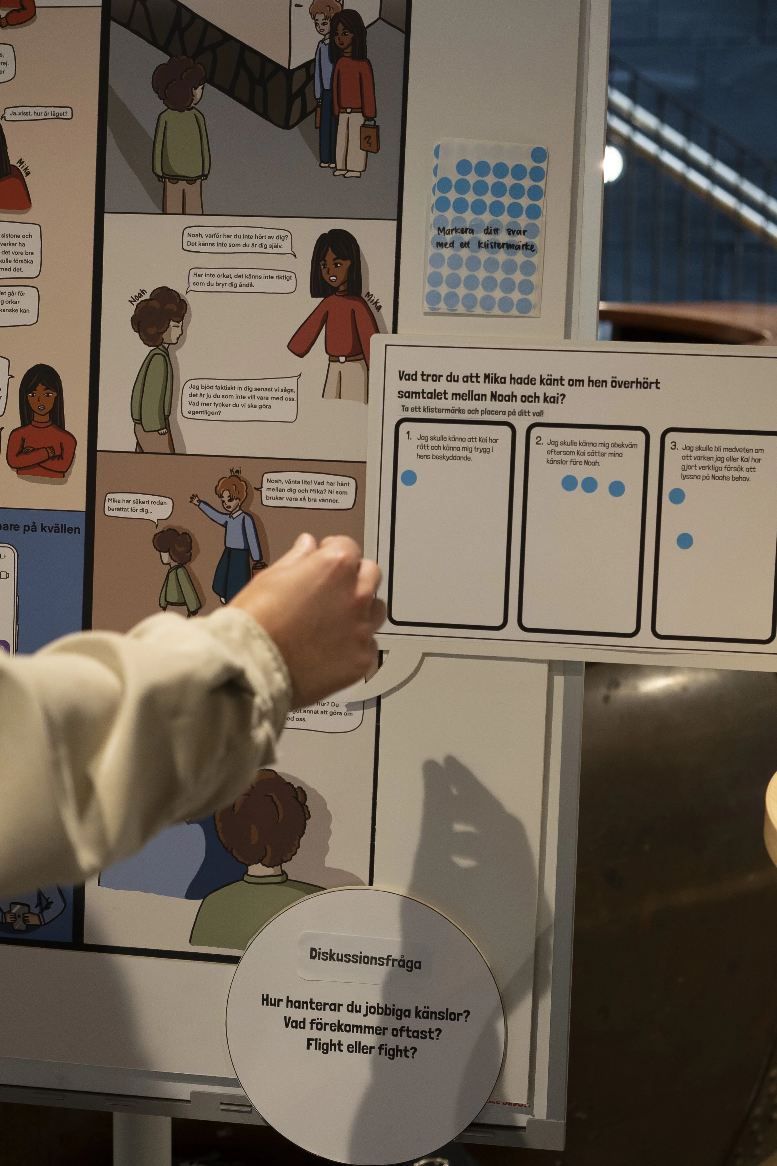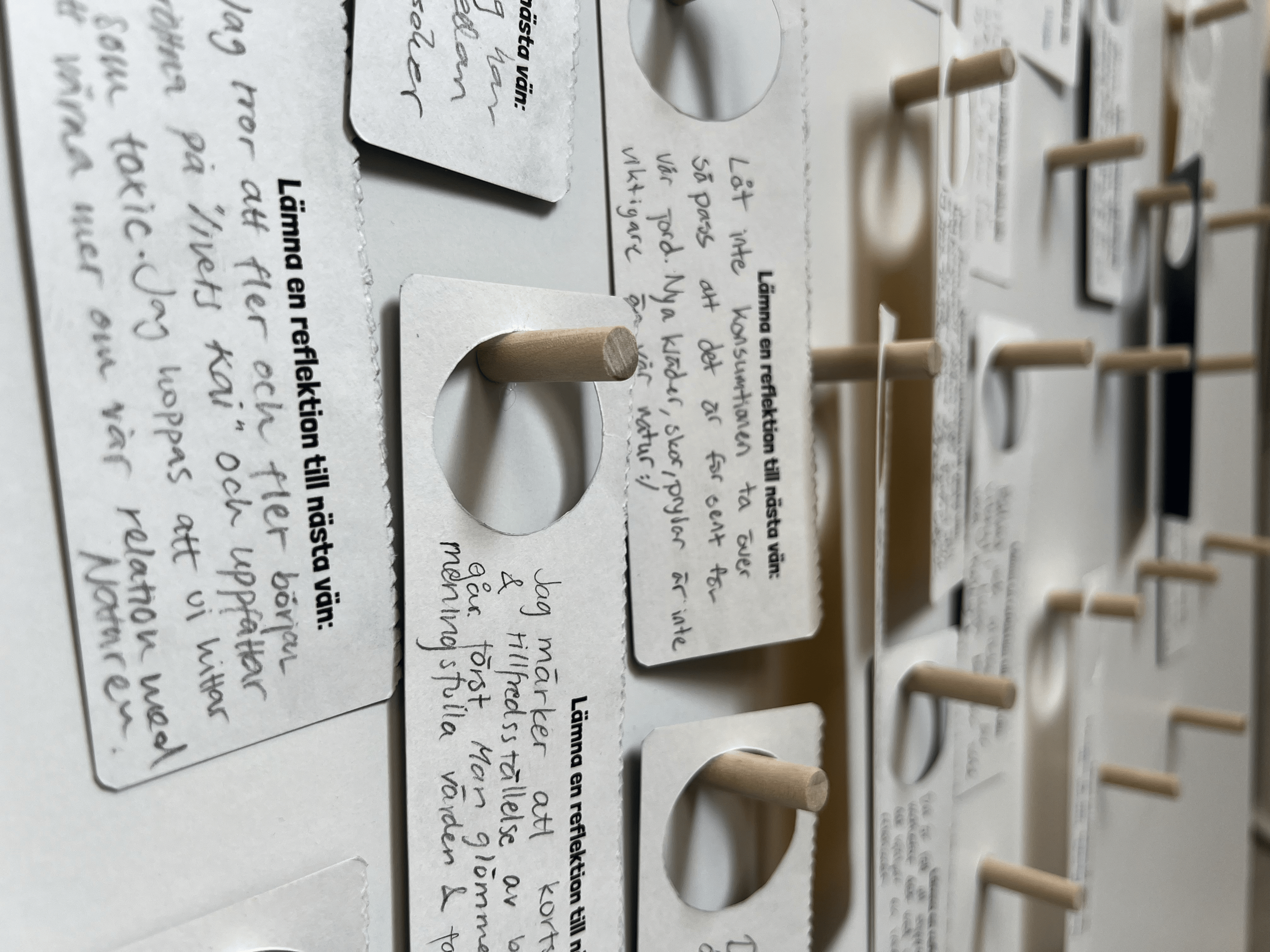 The installation was displayed in an exhibition open for the public in Chalmers main building Kårhuset for 4 hours, and resulted in a combined total of 24 reflections and very positive reception. All reflections focus on creating healthier relationships and dynamics, highlighting human care for other things than themselves, and making time to consciously assess the implication of one's consumption habits.