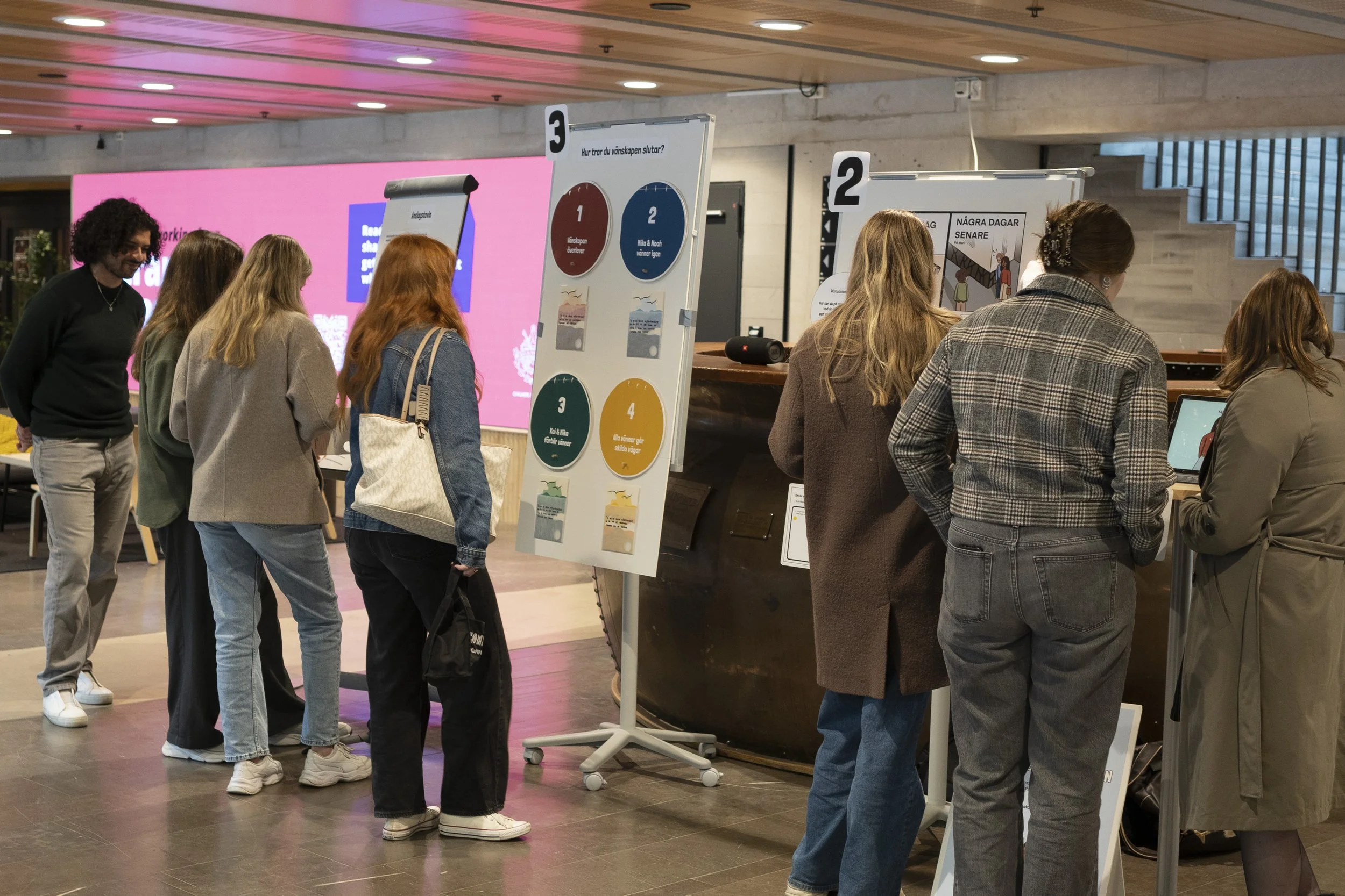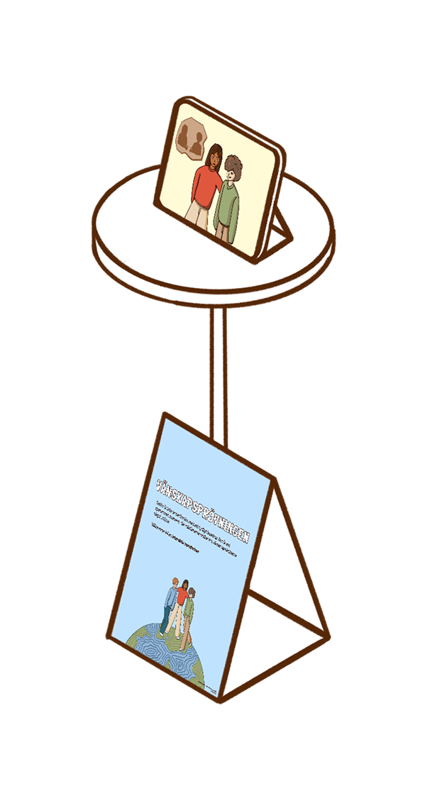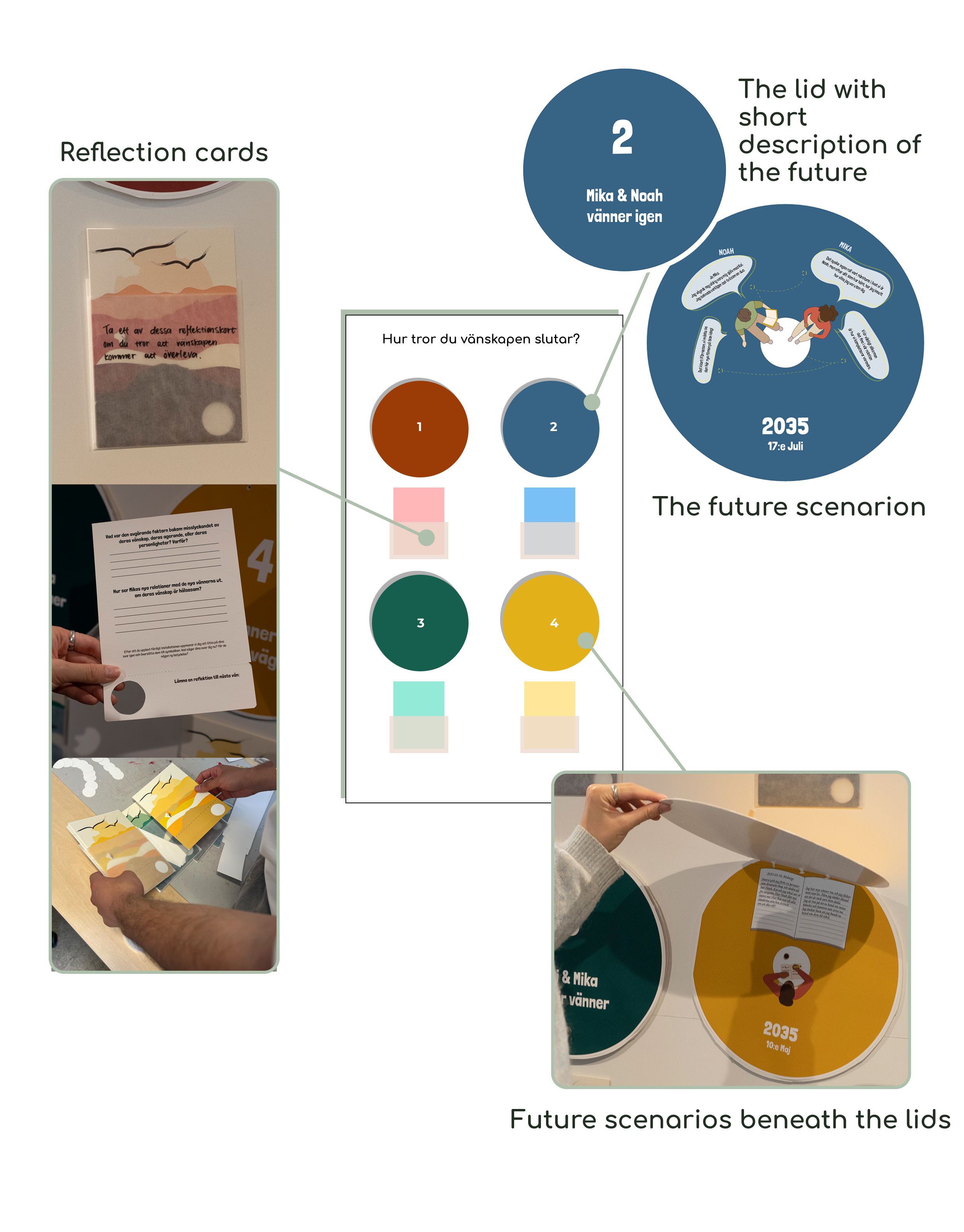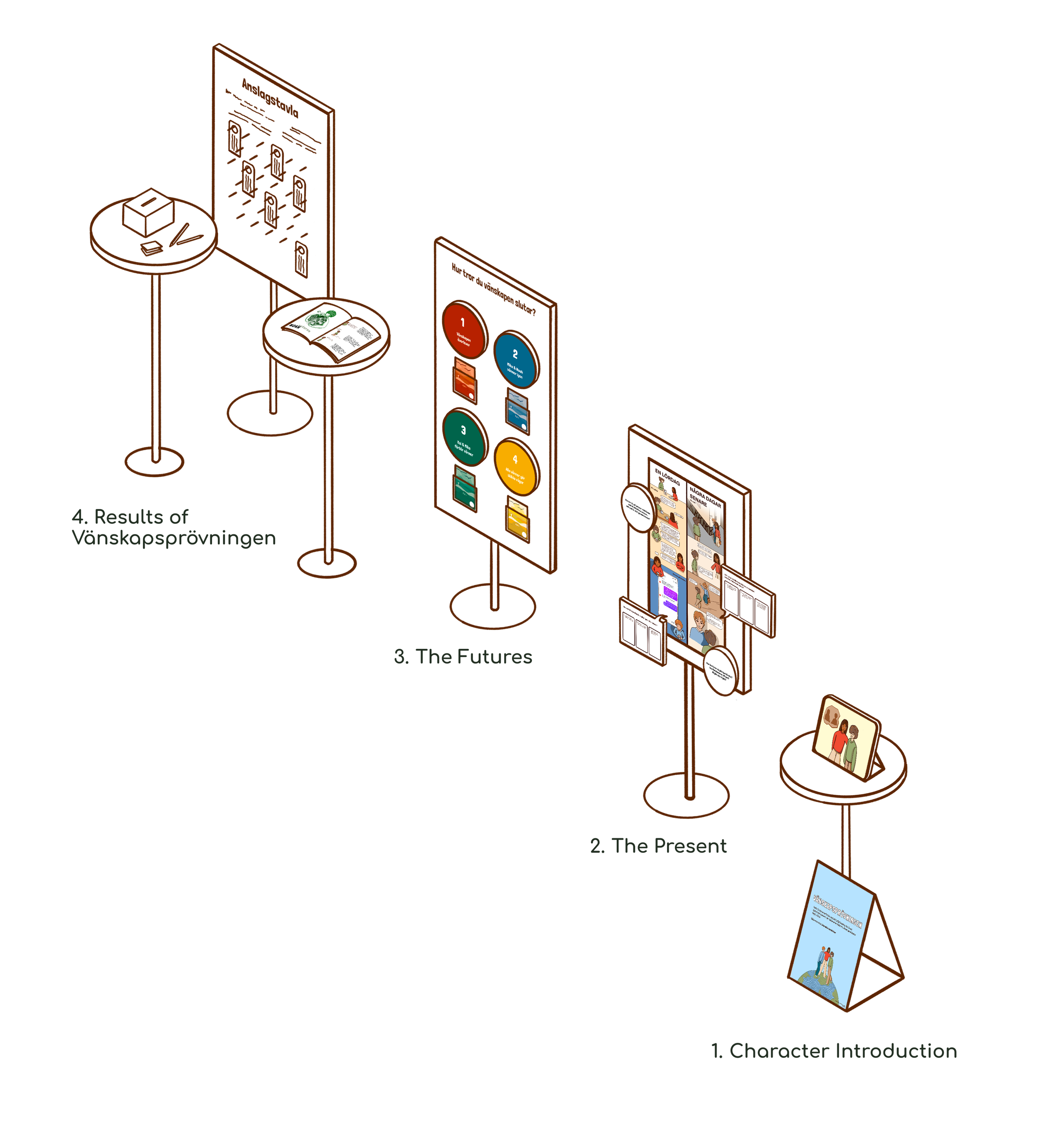 The final design takes form in an interactive installation that we call Vänskapsprövningen. It is a symbolic and metaphoric storytelling experience that makes room for reflection and dialogue. It is divided into four different story sections: The Character Introduction, The Present, The Futures and The Results of Vänskapsprövningen.
