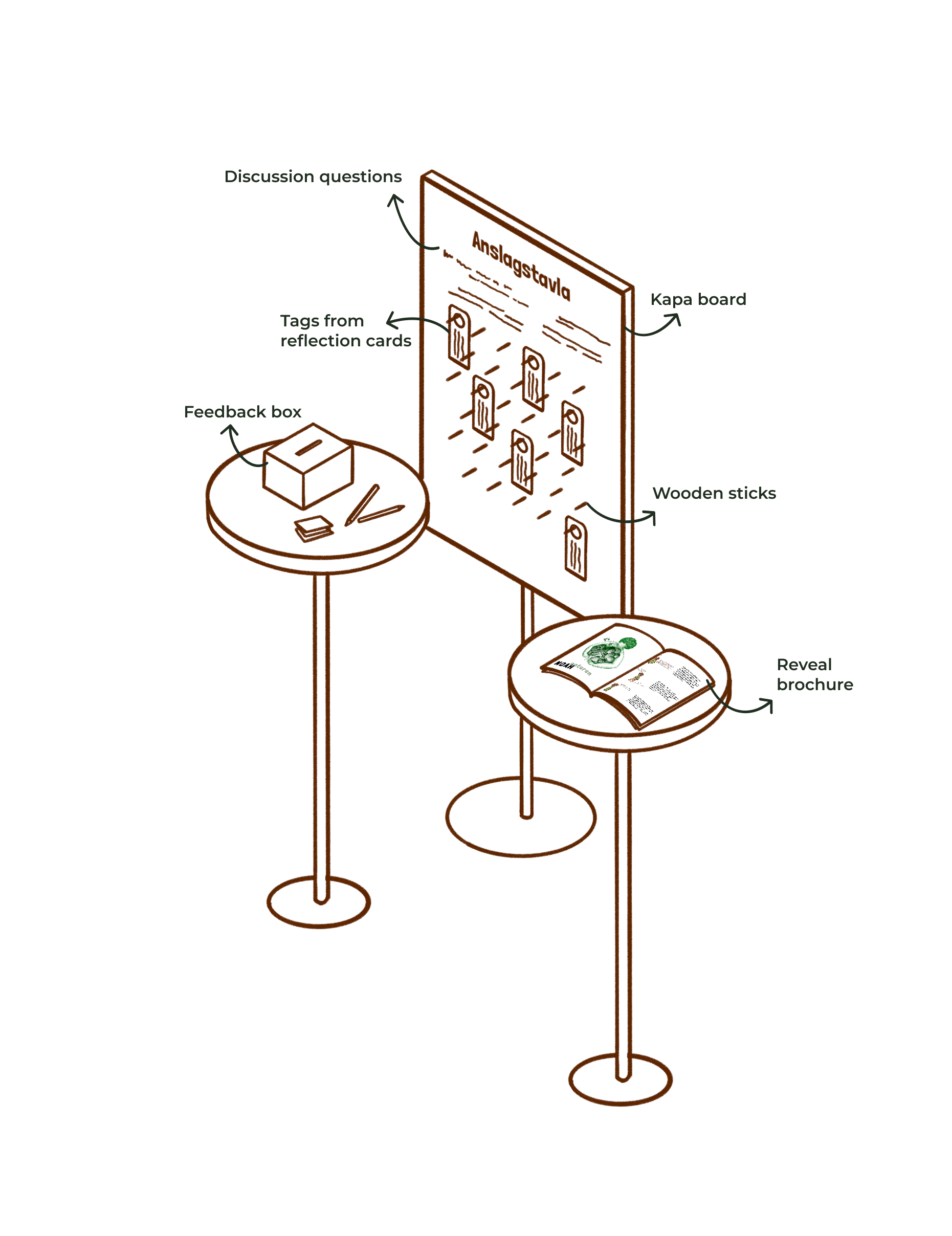 • Brochure + bulletin board, to enhance the ‘here is your result’ factor, add a plot twist element and help the interactors be inspired by and inspire others