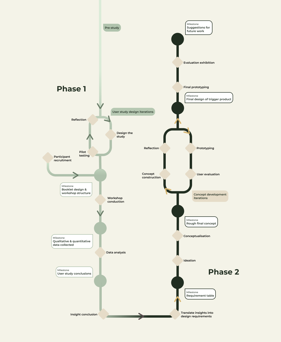 The design phase was structured to support both divergent and convergent exploration of the solution space. The process moved from translating analysis conclusions from the previous phase into design requirements, generating a variety of ideas, to deciding design direction and developing the holistic final concept. Finally the trigger product was also evaluated in an exhibition setting.